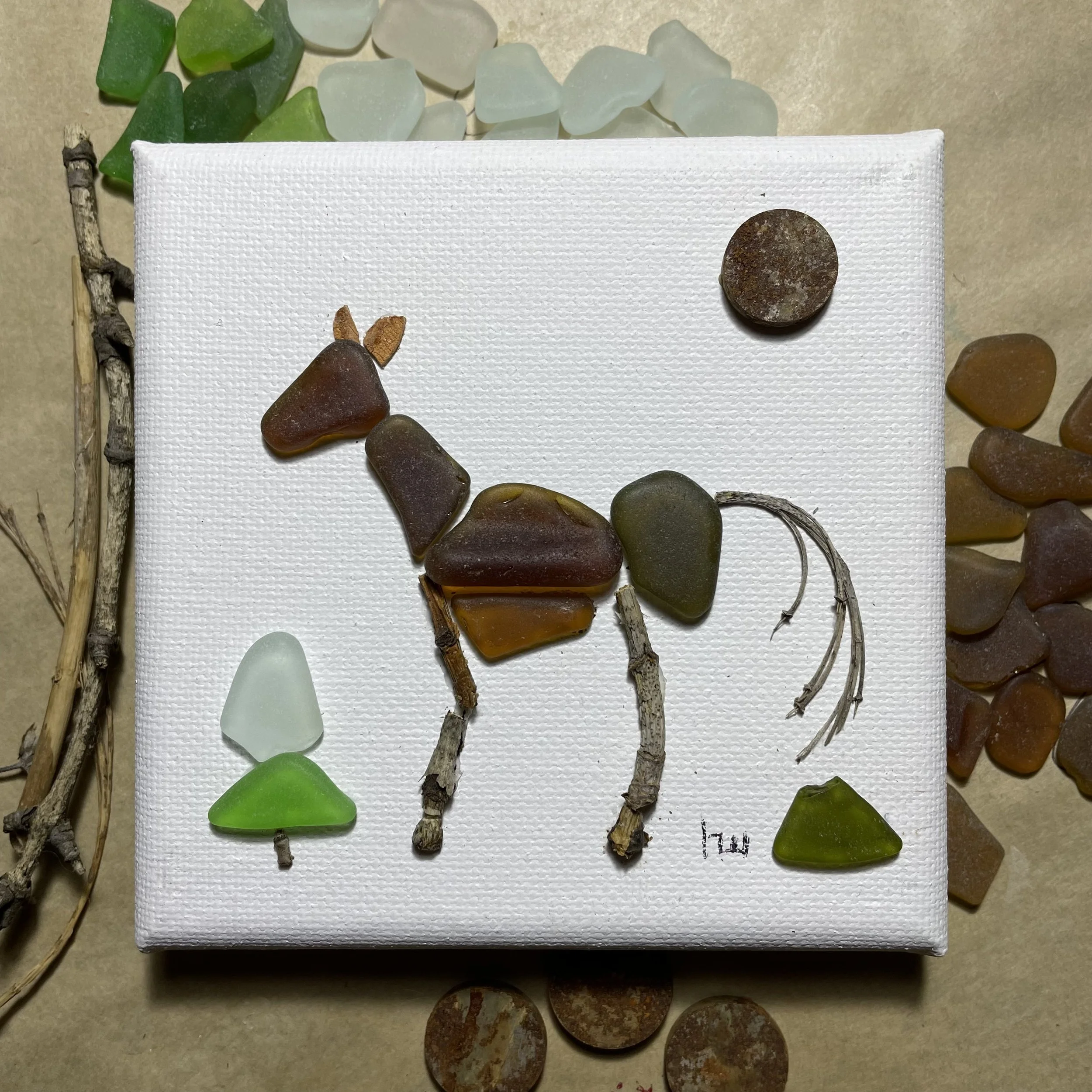 Inspired by beach walks, found objects, and childhood memories of the sweet pebble sculptures that my Tante A used to make long ago, I’m enjoying creating these tangible moments in time using my collection of authentic sea glass from the shores of the Atlantic Ocean and the Dead Sea, smooth pebbles from Lake Ontario beaches, rusty metal from local scrap yards, leather from my craft box, and grasses and twigs from my yard.